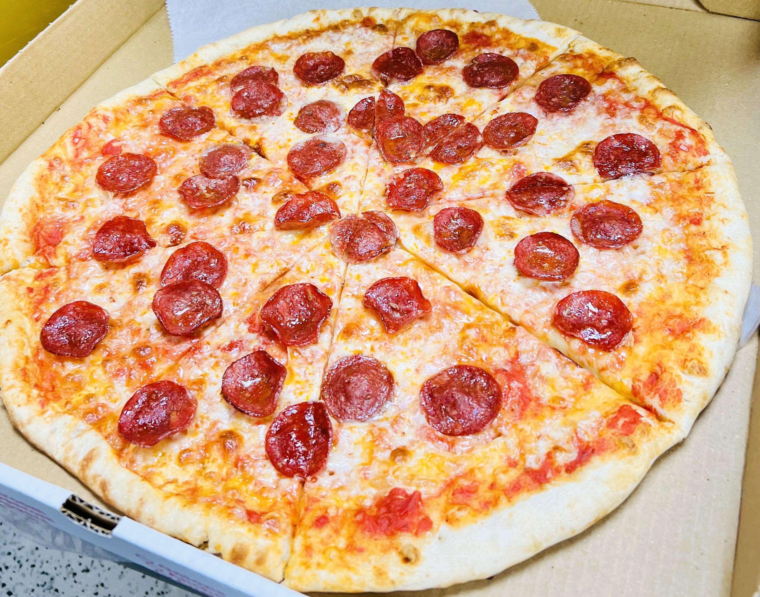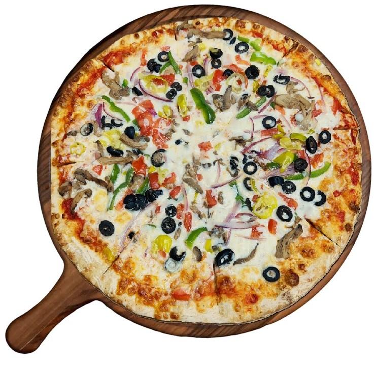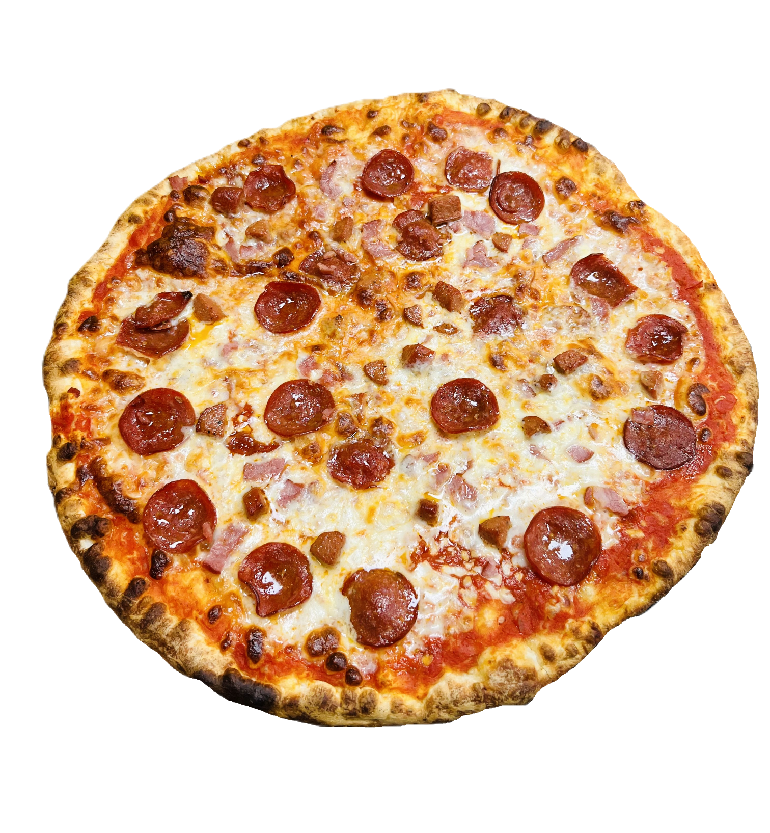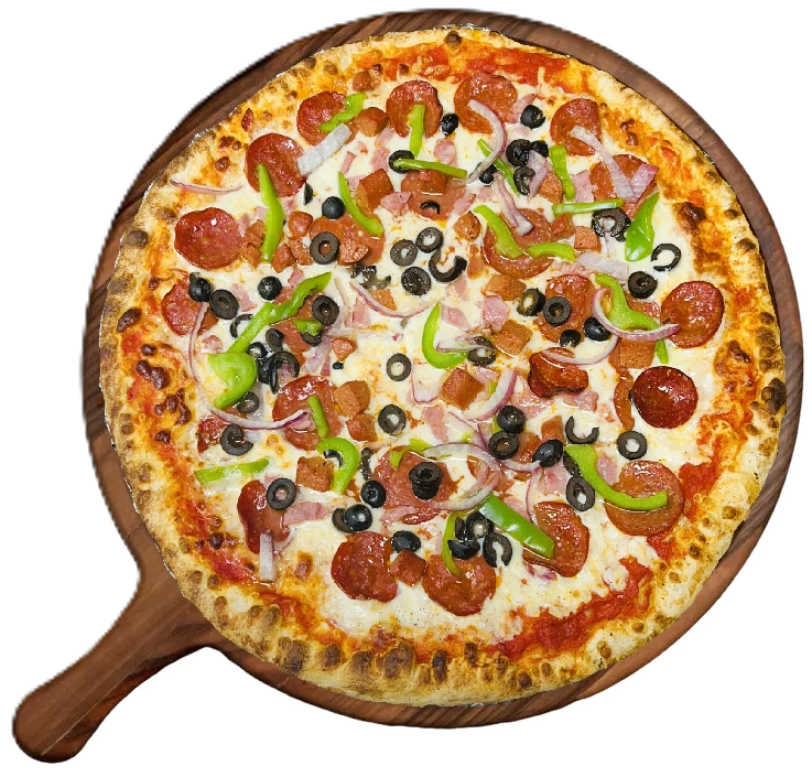 Pepperoni, Smoked Beef Sausage, Smoked Turkey Bacon, Bell Peppers, Onions & Black Olives