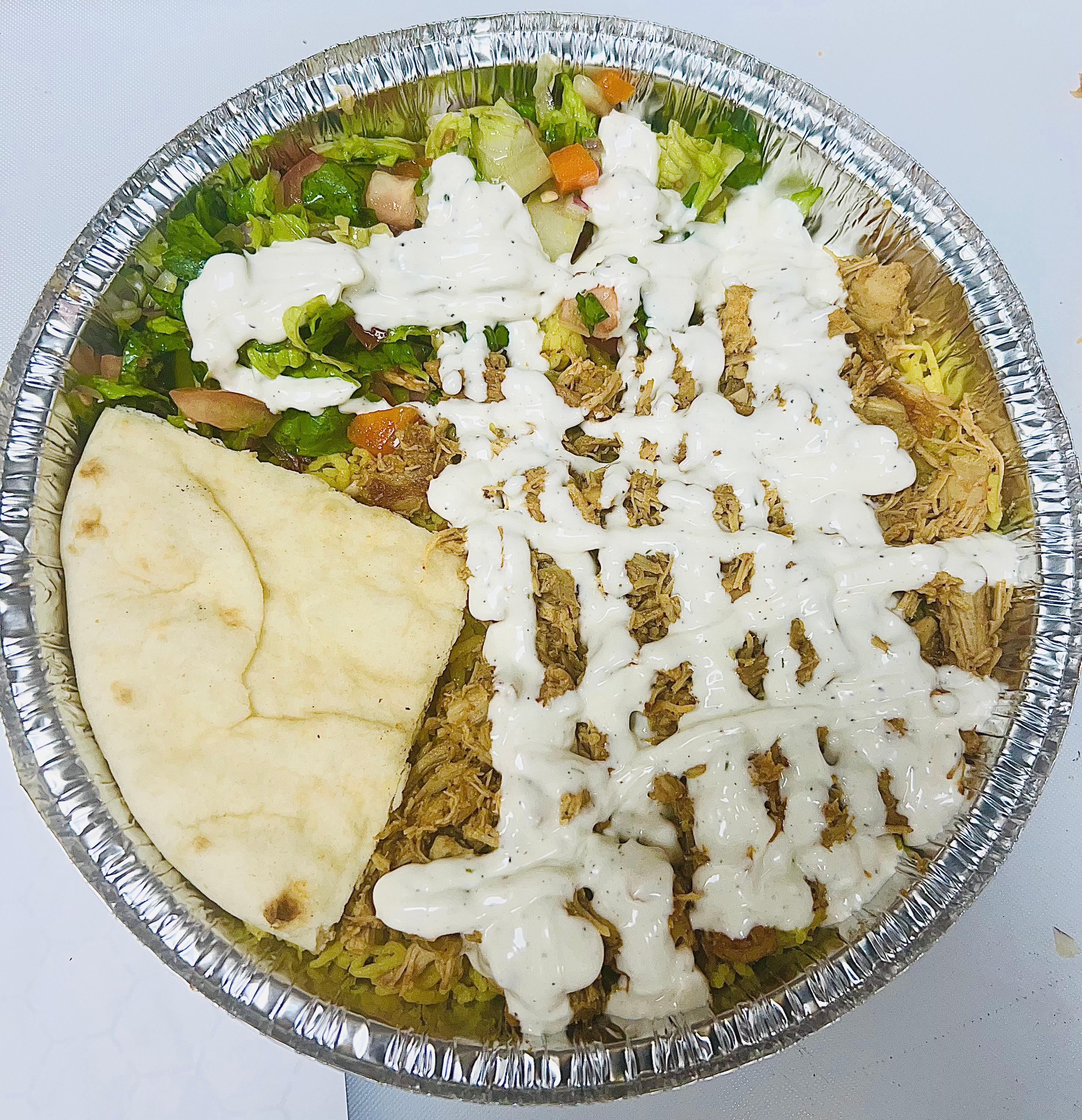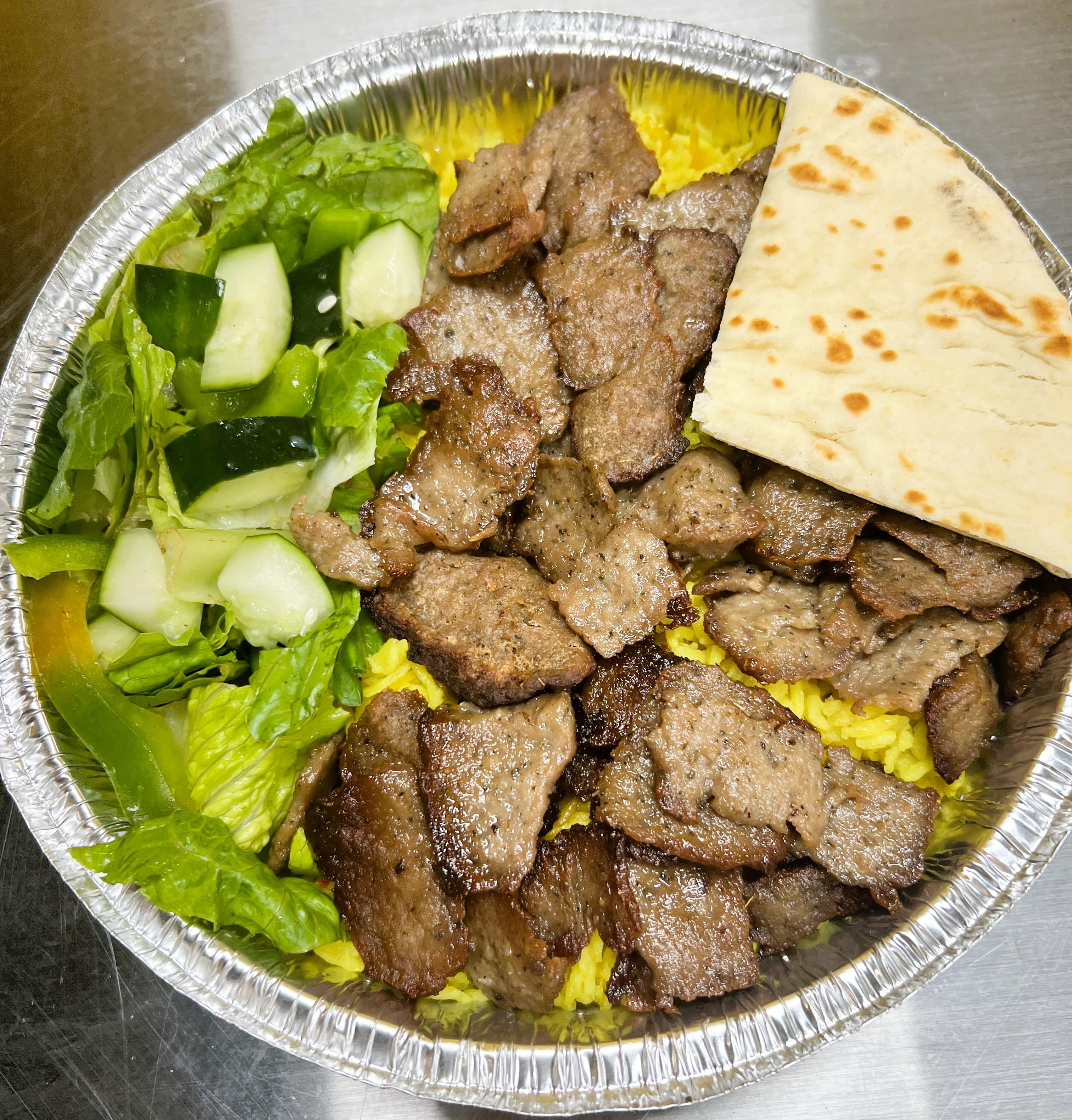 Seasoned gyro meat served over fragrant rice with a fresh, crisp salad and warm pita on the side, paired with our signature creamy white sauce and bold, spicy hot red sauce on the side.