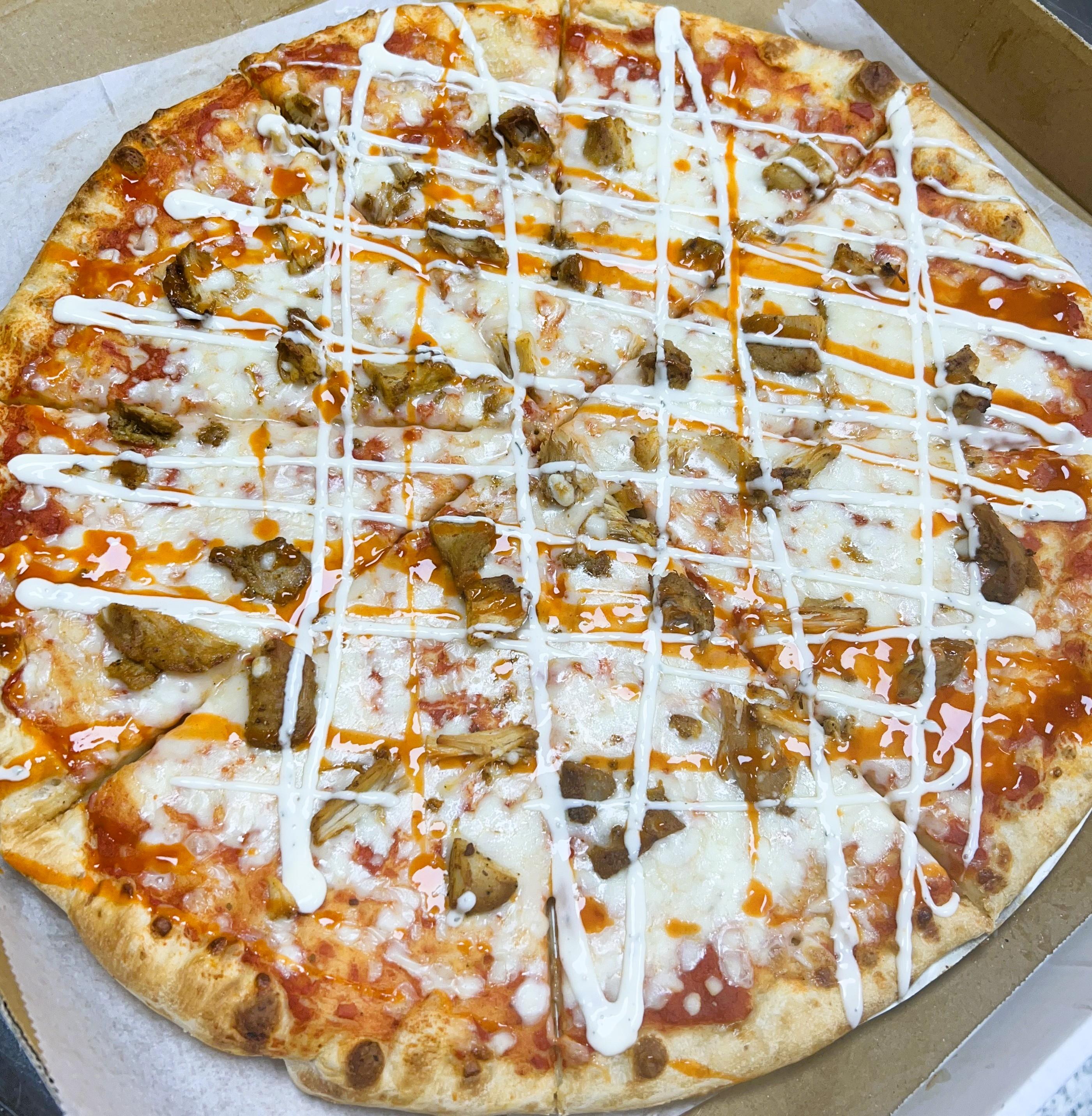 Tender seasoned chicken, with a rich blend of New York mozzarella cheeses, all finished with a creamy ranch drizzle & spicy buffalo sauce