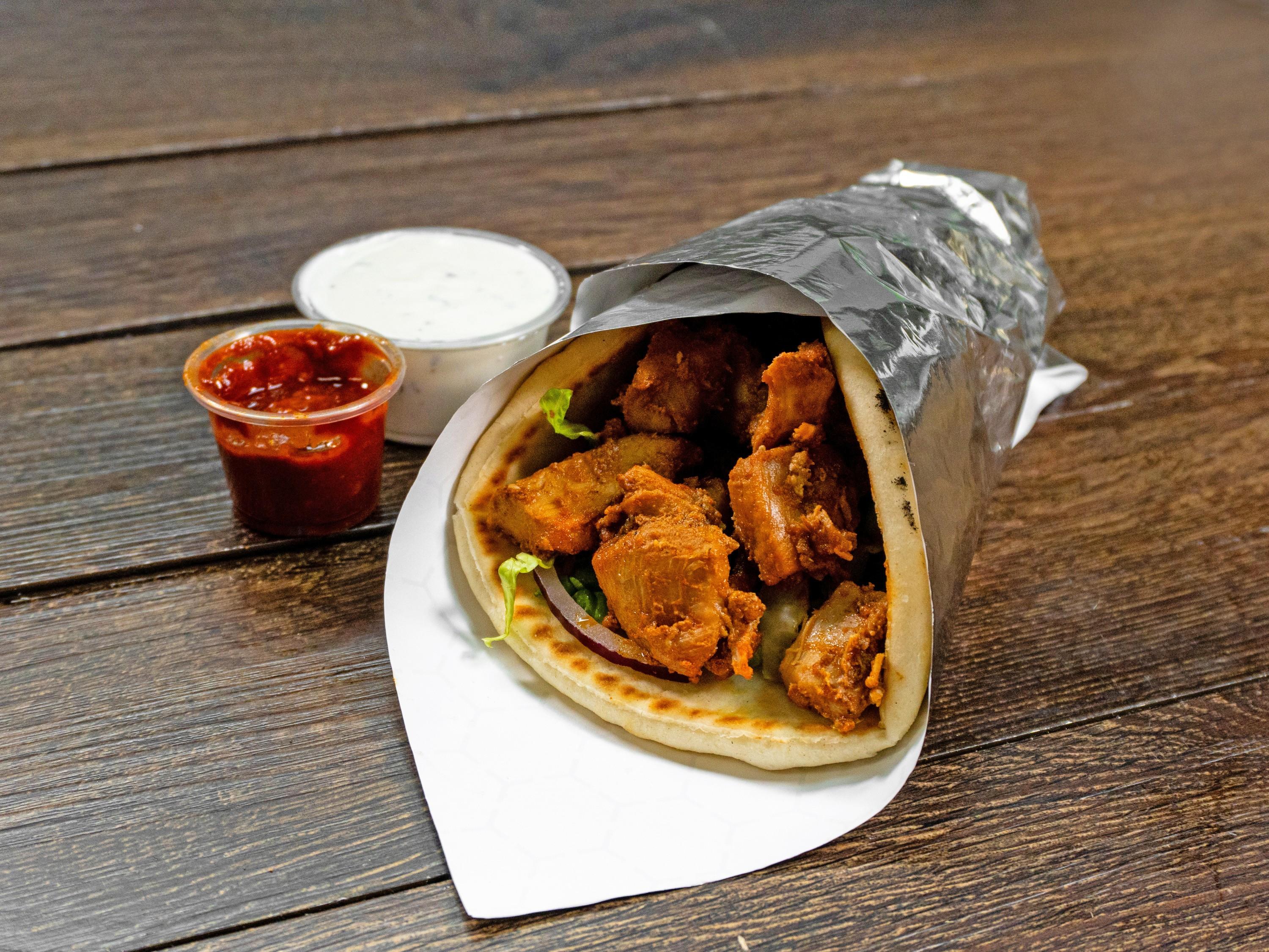 Seasoned Chicken in a warm Pita with fresh lettuce, cucumbers & onions, paired with our signature creamy white sauce and spicy hot red sauce on the side.