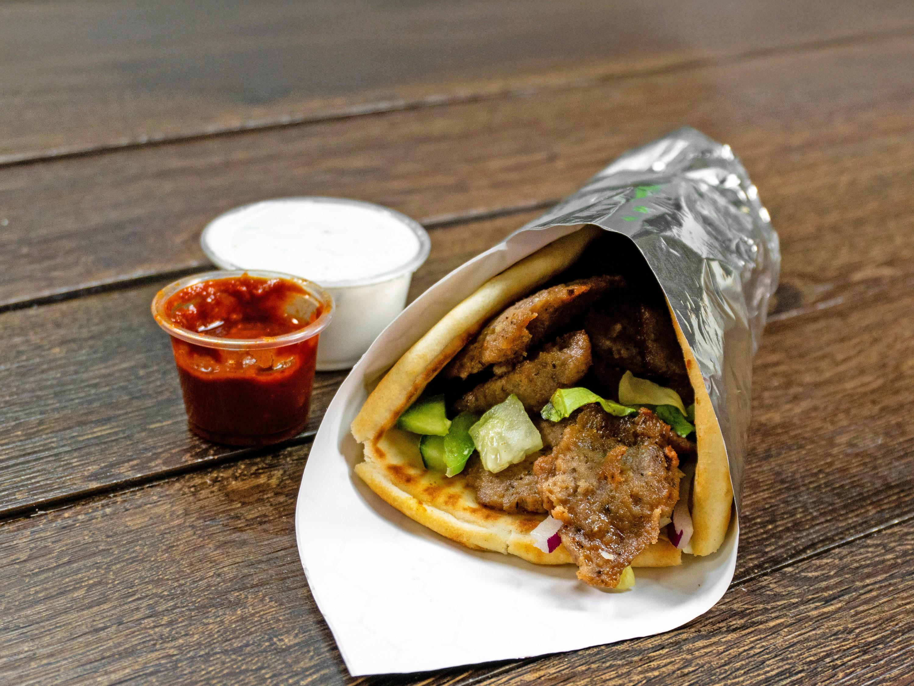 Savory, seasoned Gyro meat in a warm Pita with fresh lettuce and cucumbers, paired with our signature creamy white sauce and spicy hot red sauce on the side.
