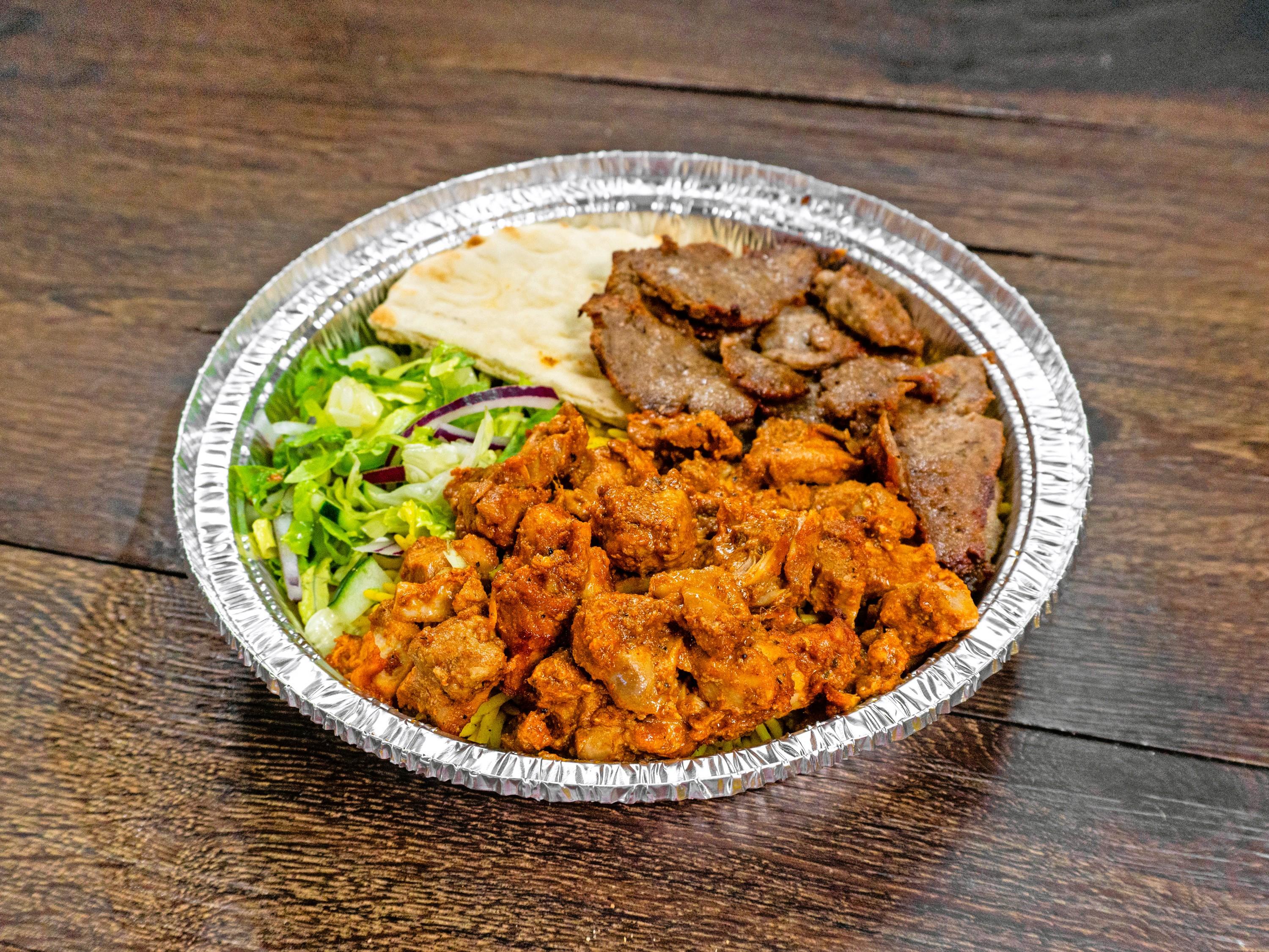 Seasoned Chicken & Gyro meat served over fragrant rice with a fresh, crisp salad and warm pita on the side, paired with our signature creamy white sauce and bold, spicy hot red sauce on the side.