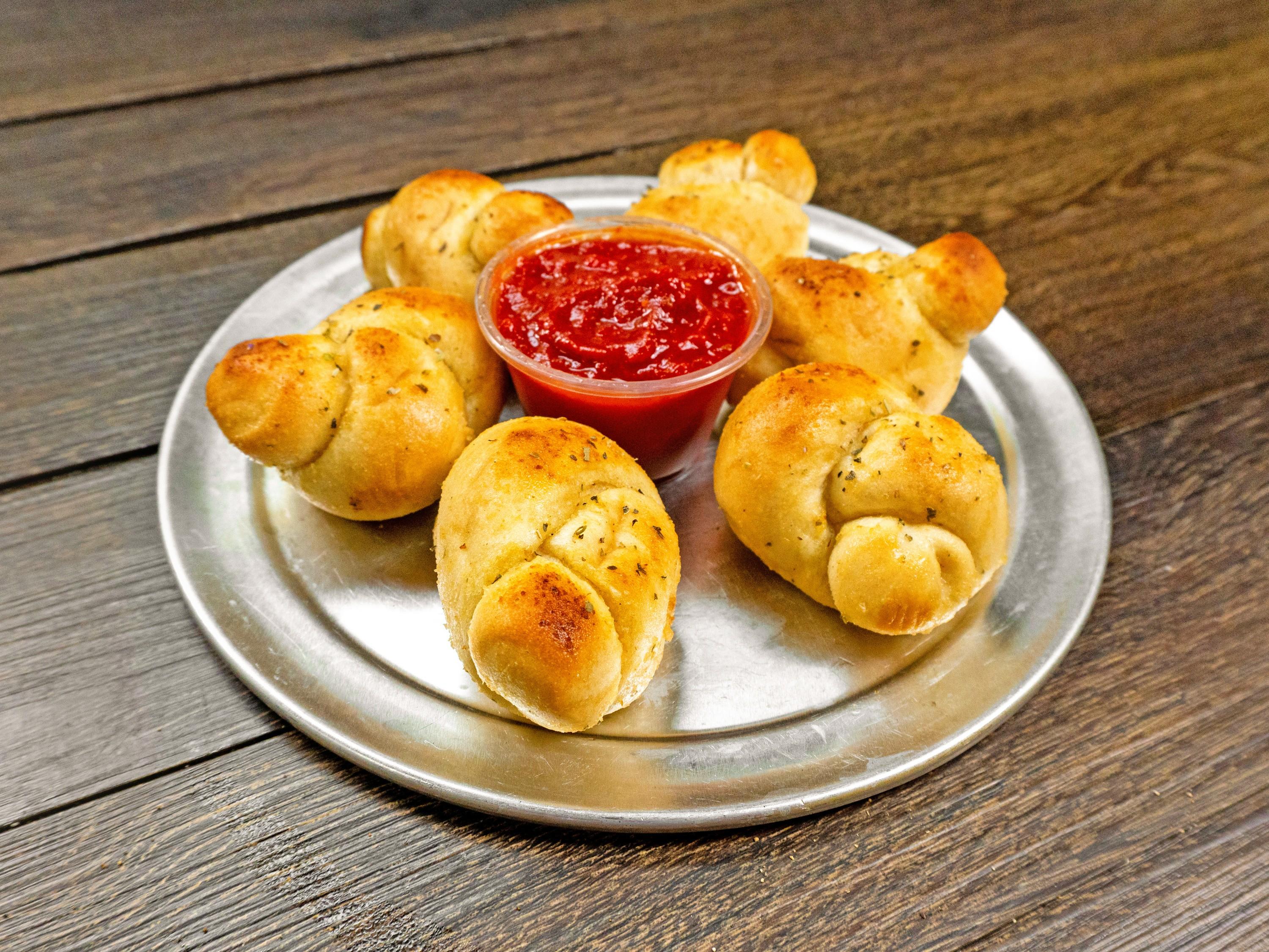 Soft, buttery garlic knots brushed with garlic butter & herbs, served with a side of marinara.